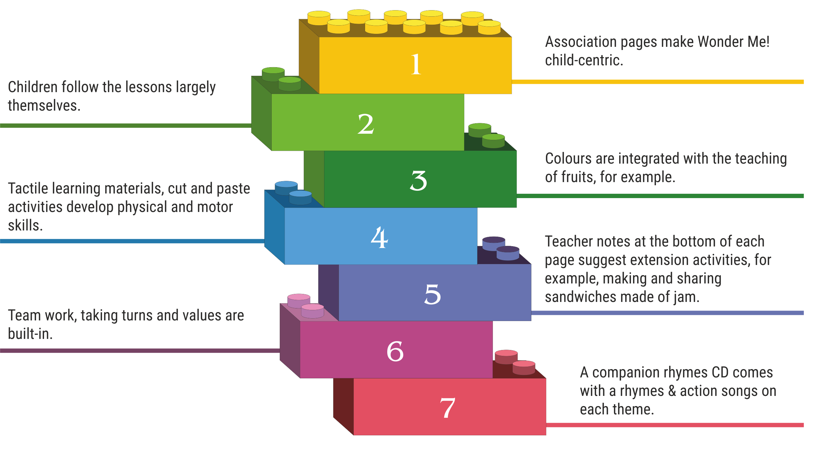 Theme vegetables are integrated in Wonder Me! The teaching of numbers, and arts & crafts combined with the teaching of animals, as examples